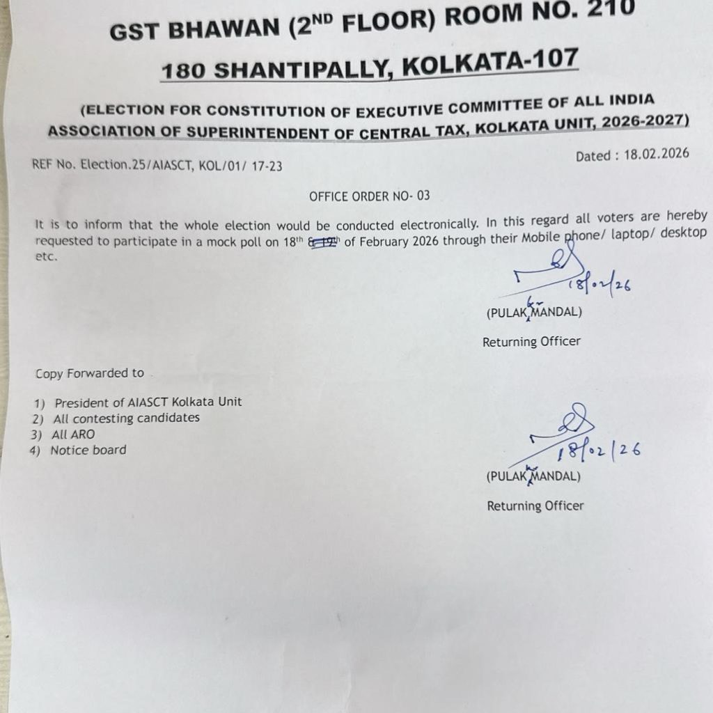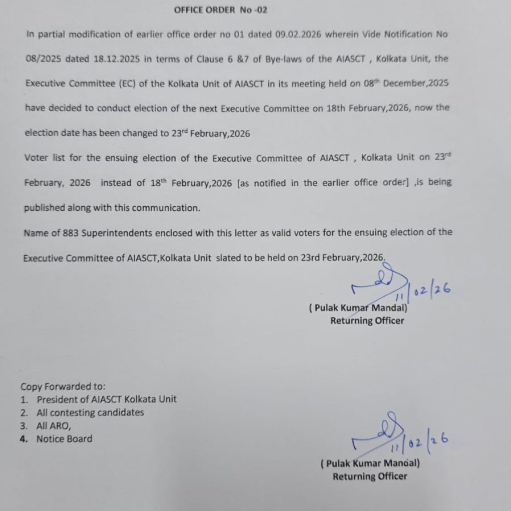 This is to inform all members that, in partial modification of earlier Office Order No. 01 dated 09.02.2026, the date of election for the Executive Committee of AIASCT, Kolkata Unit has been rescheduled.